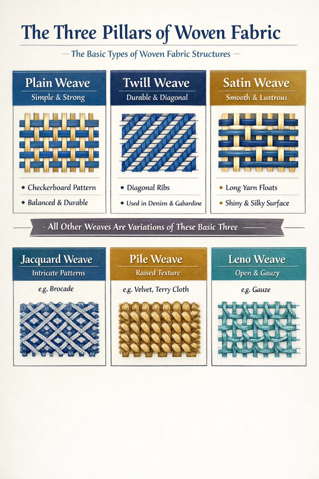 Selv om det er hundrevis av spesifikke markedsnavn for tekstiler, er det teknisk sett tre grunnleggende typer vevd stoff strukturer som nesten alle andre er avledet fra: Enkel vev, kypertvev og satengvev . Alle andre varianter, for eksempel Jacquard-, Dobby- eller Haug-vever, er en kompleks modifikasjon av disse tre grunnleggende sammenflettede mønstrene. Å forstå disse kategoriene er avgjørende for å identifisere holdbarheten, draperingen og nytten til ethvert tekstilprodukt.