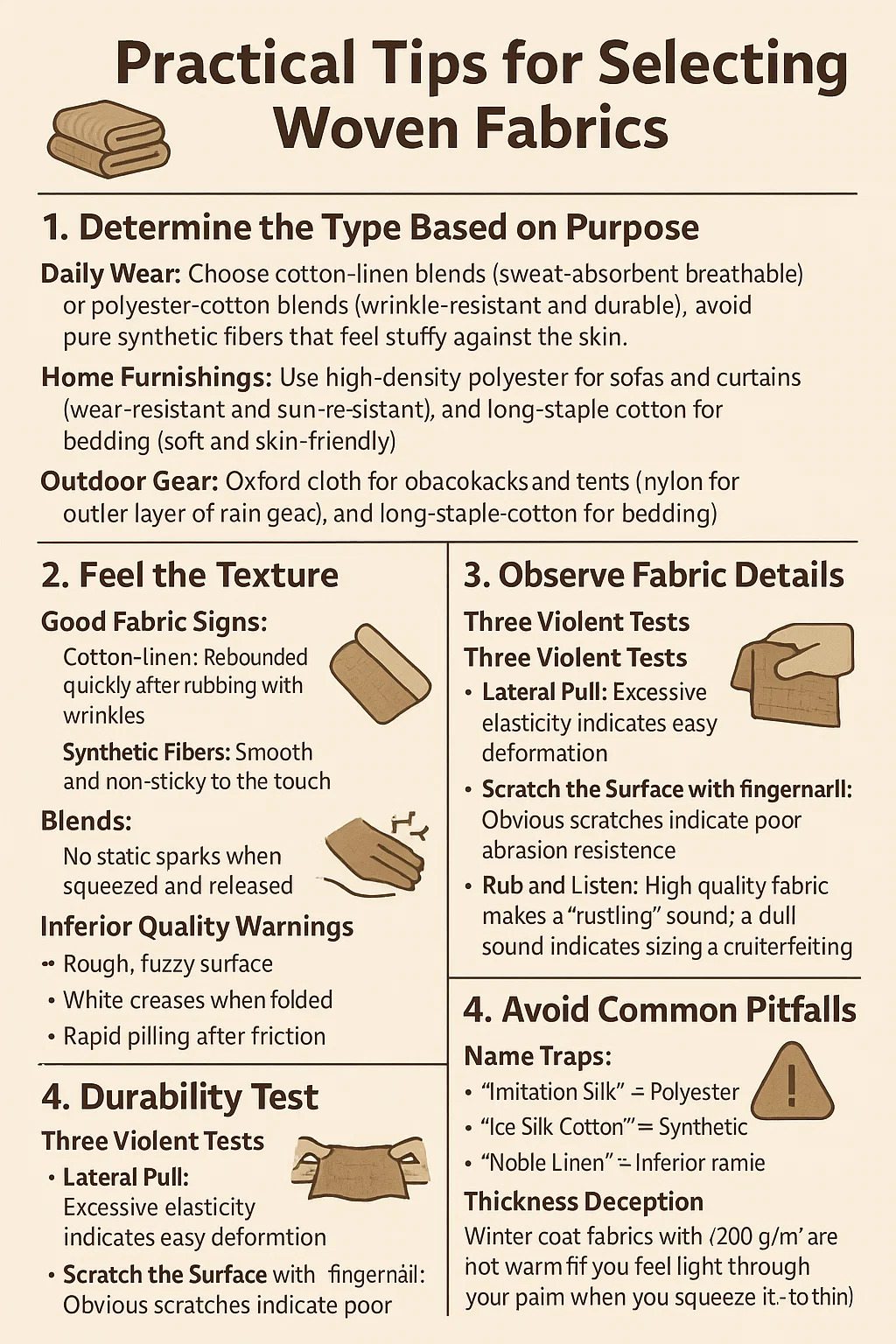 Teksturklarhet: Undersøk varp- og vefttrådene mot lyset – høykvalitetsstoffer har pene, sjakkbrettlignende mønstre, mens dårlige stoffer har ødelagte tråder eller ujevn tetthet.