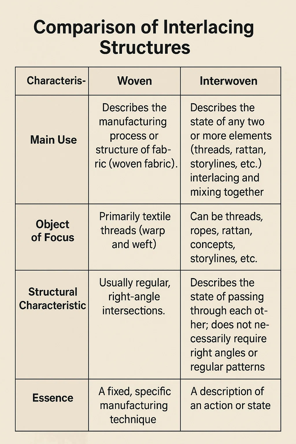 | Primær bruk | Beskriver den spesifikke produksjonsprosessen eller den ferdige strukturen til tekstiler (vevd stoff). | Beskriver tilstanden der to eller flere sett med elementer (tråder, siv, historielinjer, osv.) er krysset eller blandet. |