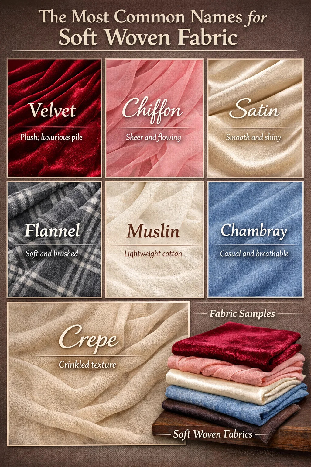 Når folk spør "hva er navnet på mykt vevd stoff", avhenger svaret av fiberinnholdet, vevstrukturen og finishen. De mest anerkjente myke vevde stoffene inkluderer fløyel, chiffon, sateng, muslin, flanell, chambray og crepe . Hver av disse er produsert på en vevstol ved hjelp av sammenflettede tråder, men de føles helt forskjellige fra hverandre på grunn av hvordan garnene er ordnet, tvunnet eller ferdig etter veving.