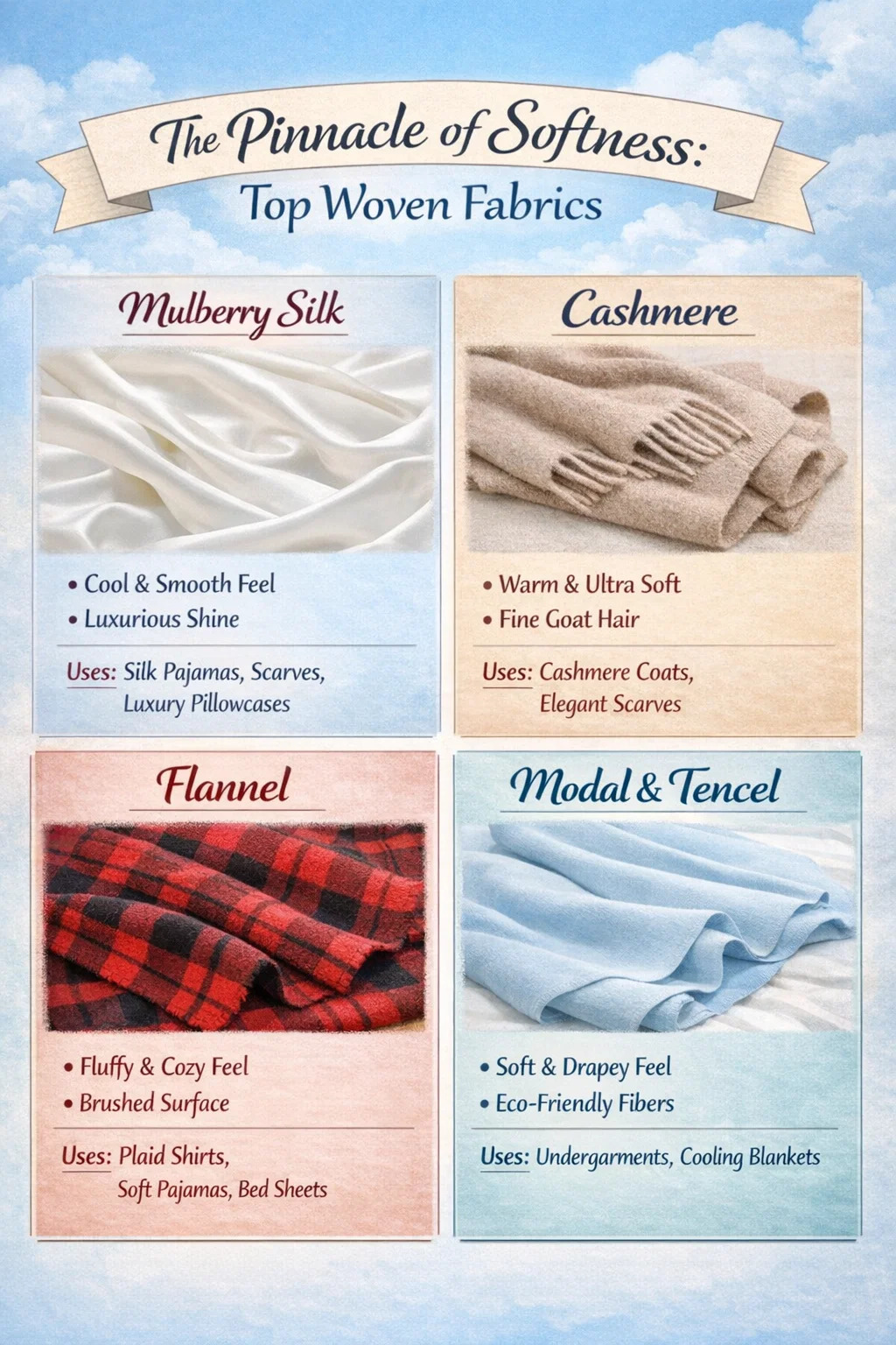 Når det gjelder de "mykeste" vevde stoffer , det avhenger virkelig av hvilken type følelse du leter etter – enten det er en skylignende luftighet eller en silkemykhet.